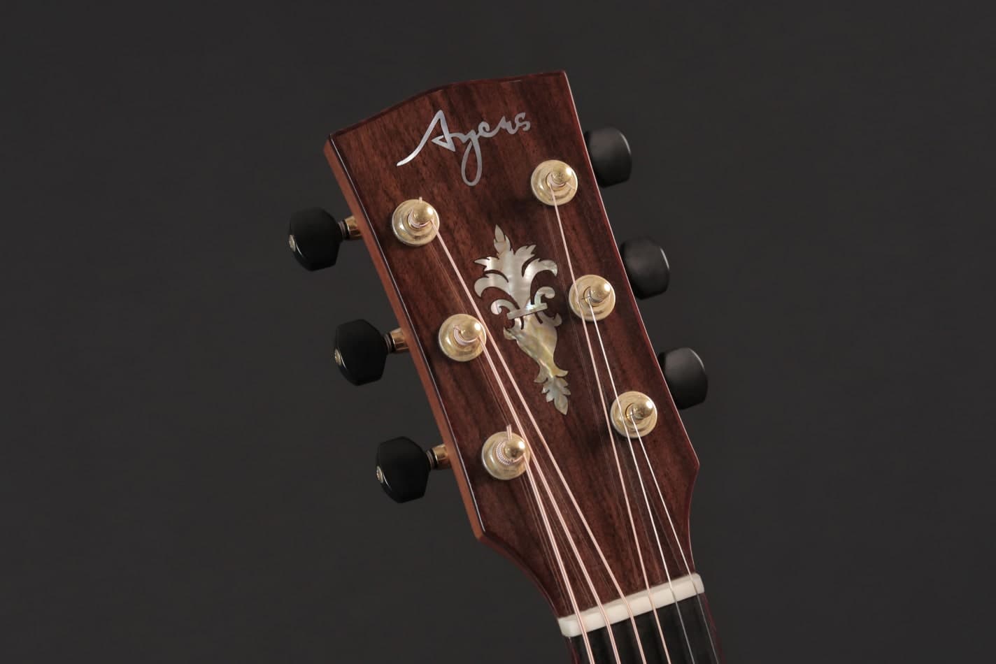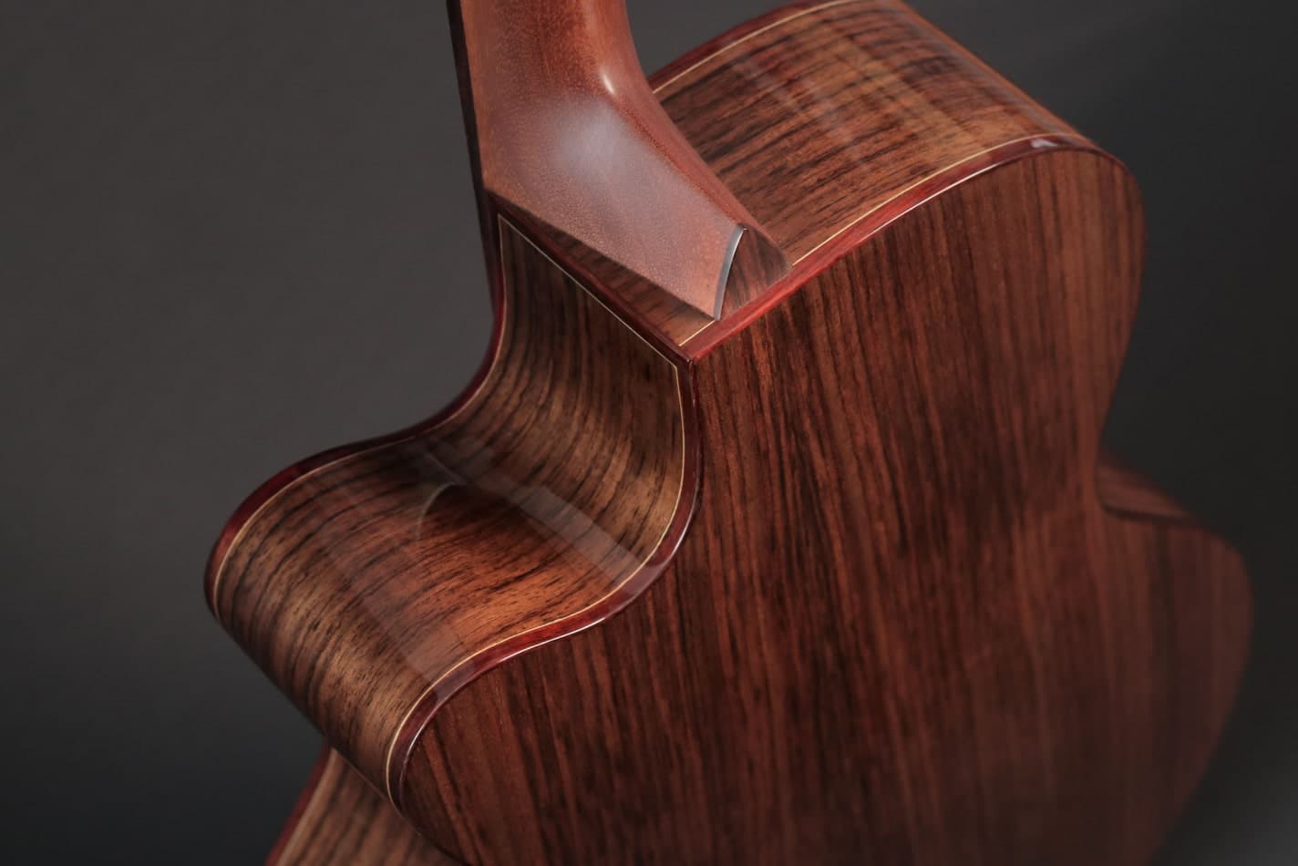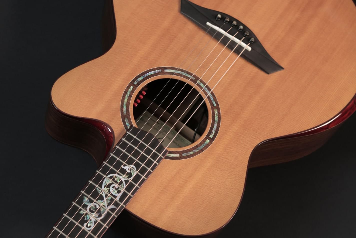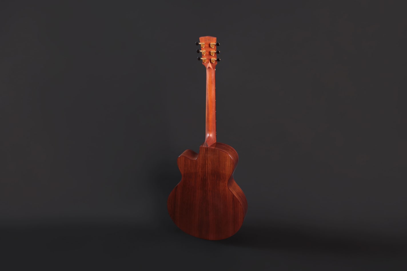 採用西提卡雲杉面板搭配印度玫瑰木側背板,結合紅花梨靠手貼片與奧昇弦釘,溫潤木質襯托指板與琴頭的藤蔓貝雕,展現 20 週年工藝匠心。 音色厚實溫暖,如藤蔓盤繞歲月,醇厚細膩且層次豐富。