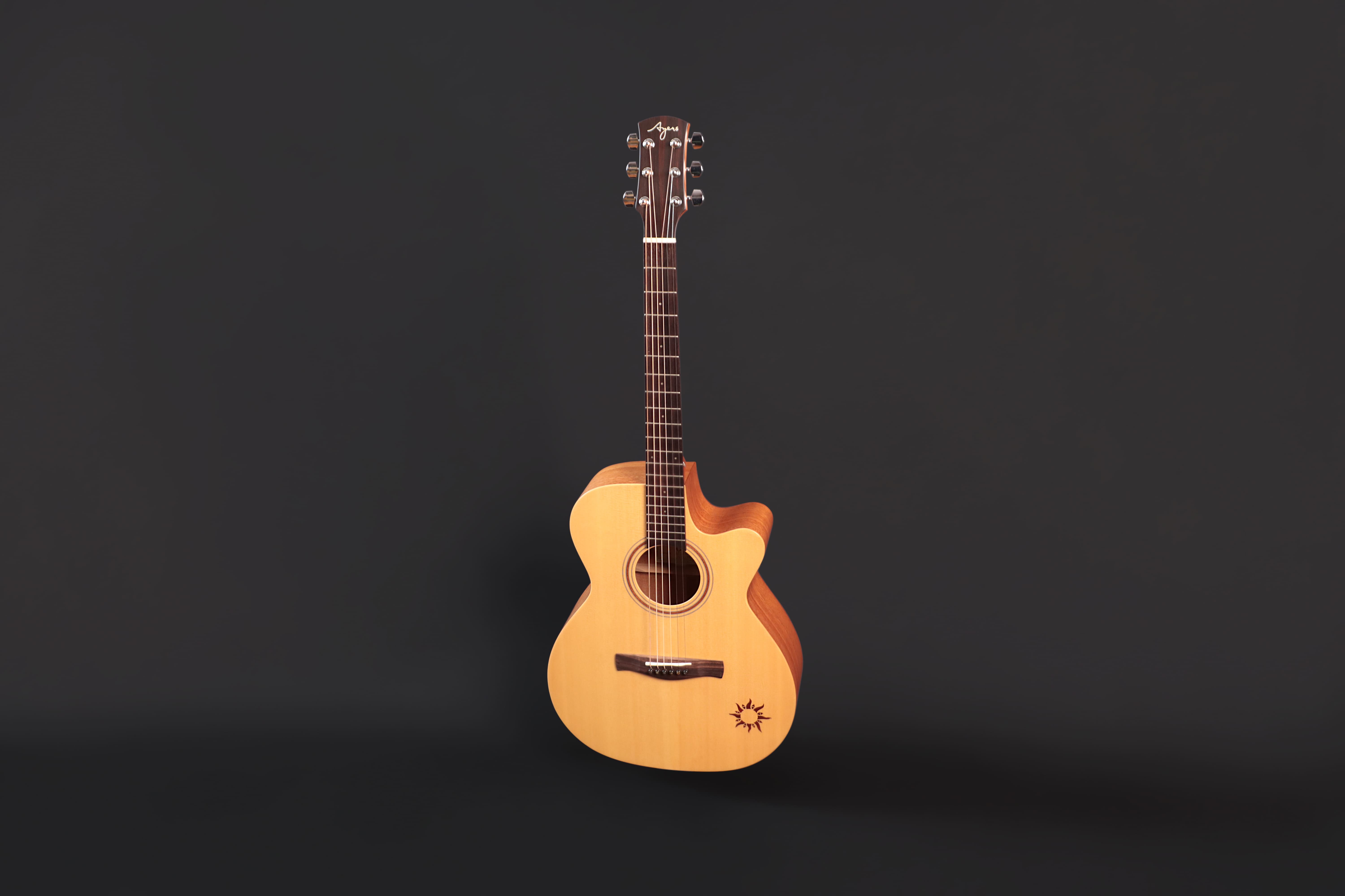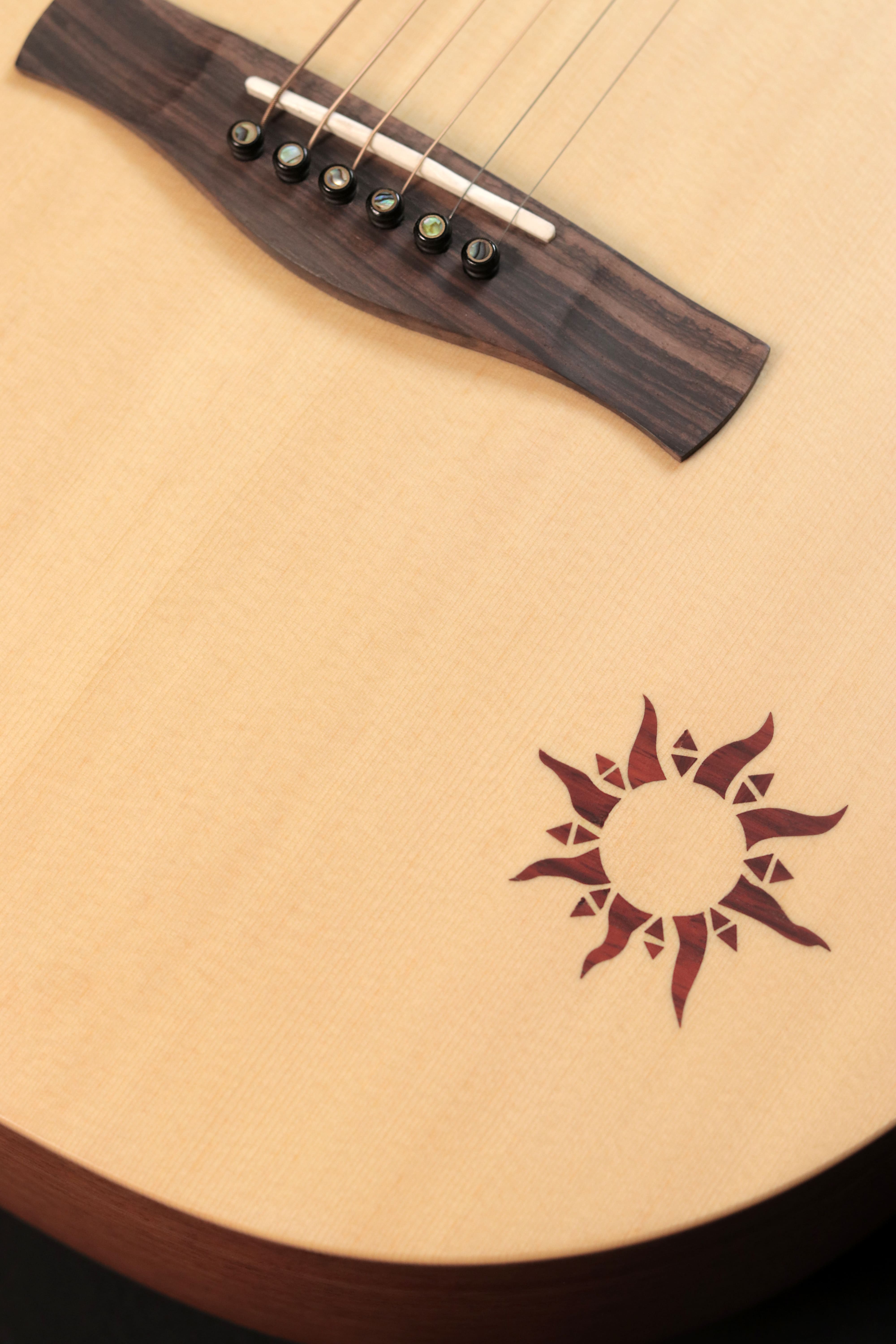 採用西提卡雲杉面板與越南桃花心木側背板,搭配奧昇弦釘,面板鑲嵌木雕小太陽圖騰,溫暖光輝自木紋間綻放,明亮而生動。 音色如暖陽映照大地,低頻穩健、中頻溫暖、高頻透亮,層次分明且充滿朝氣。