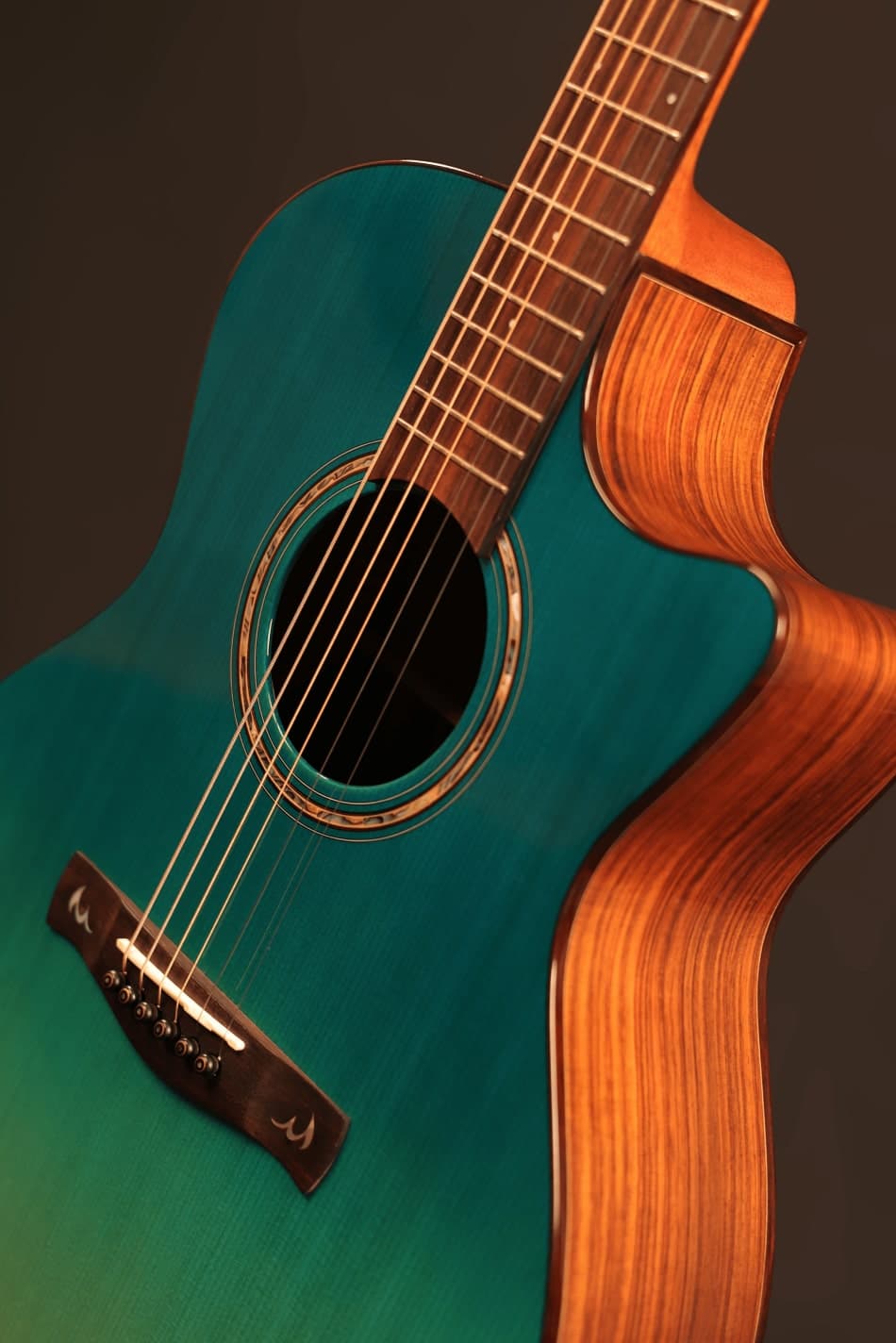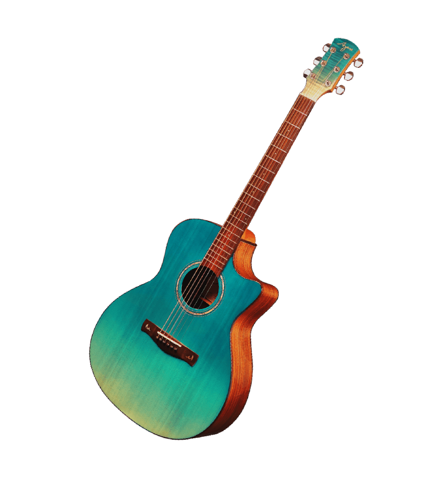 採用西提卡雲杉面板與夾板印度玫瑰木側背板,搭配如湖水般清澈的藍色漸層塗裝,細膩呈現光影流動與自然紋理。琴橋鑲嵌波浪貝殼圖騰,彷彿海面上泛起的微光漣漪,靜靜述說大海的節奏與呼吸。音色溫潤清透,低頻穩定扎實,中頻柔和飽滿,高頻帶有細緻空氣感,如海浪輕拍岸邊的律動聲線,適合抒情彈奏與旋律詮釋。