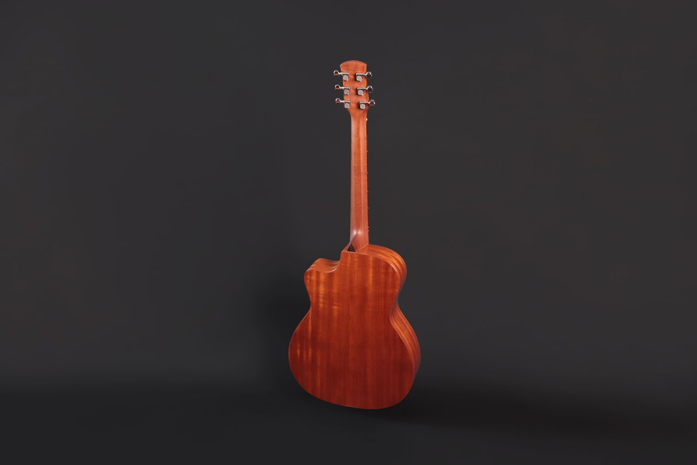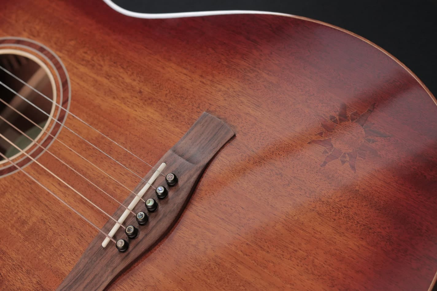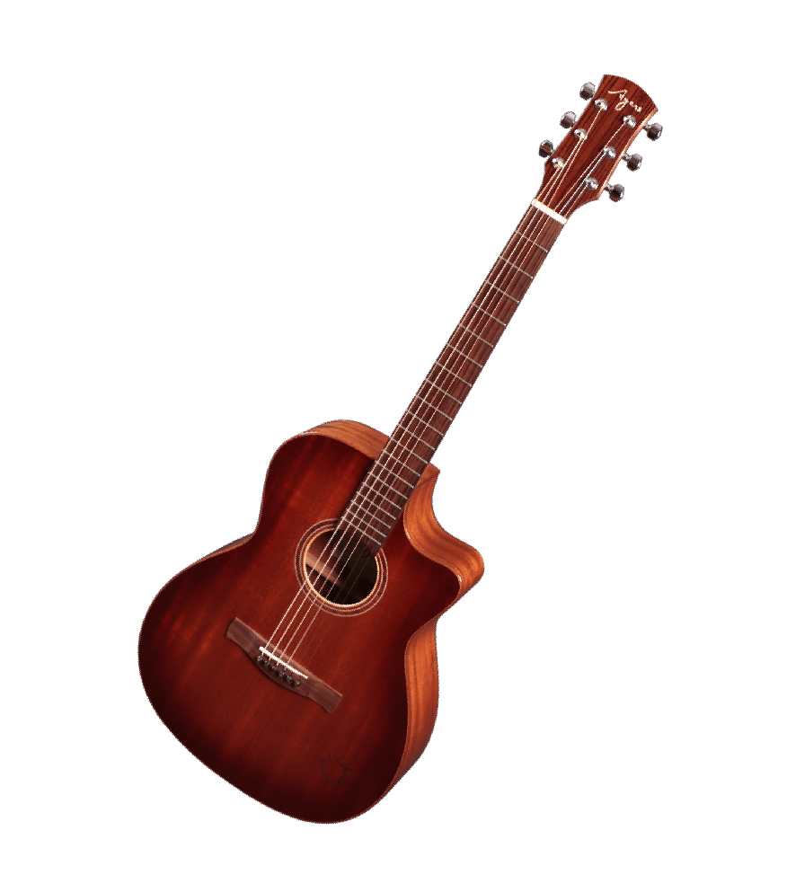採用非洲桃花心木打造面板與側背板,搭配奧昇弦釘,面板紅棕色漸層噴漆如餘暉灑落木紋,與自然木色側背相映,展現溫暖而細膩的層次。 音色如落日餘光,溫潤柔和,中頻厚實流暢,低頻輕盈且帶有自然的律動感。
