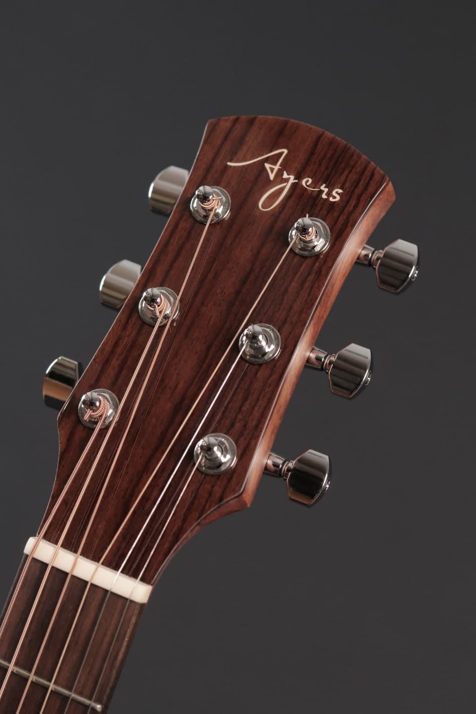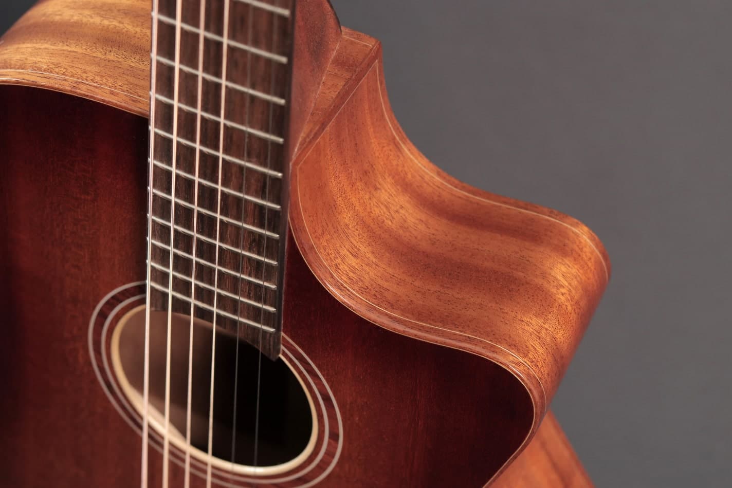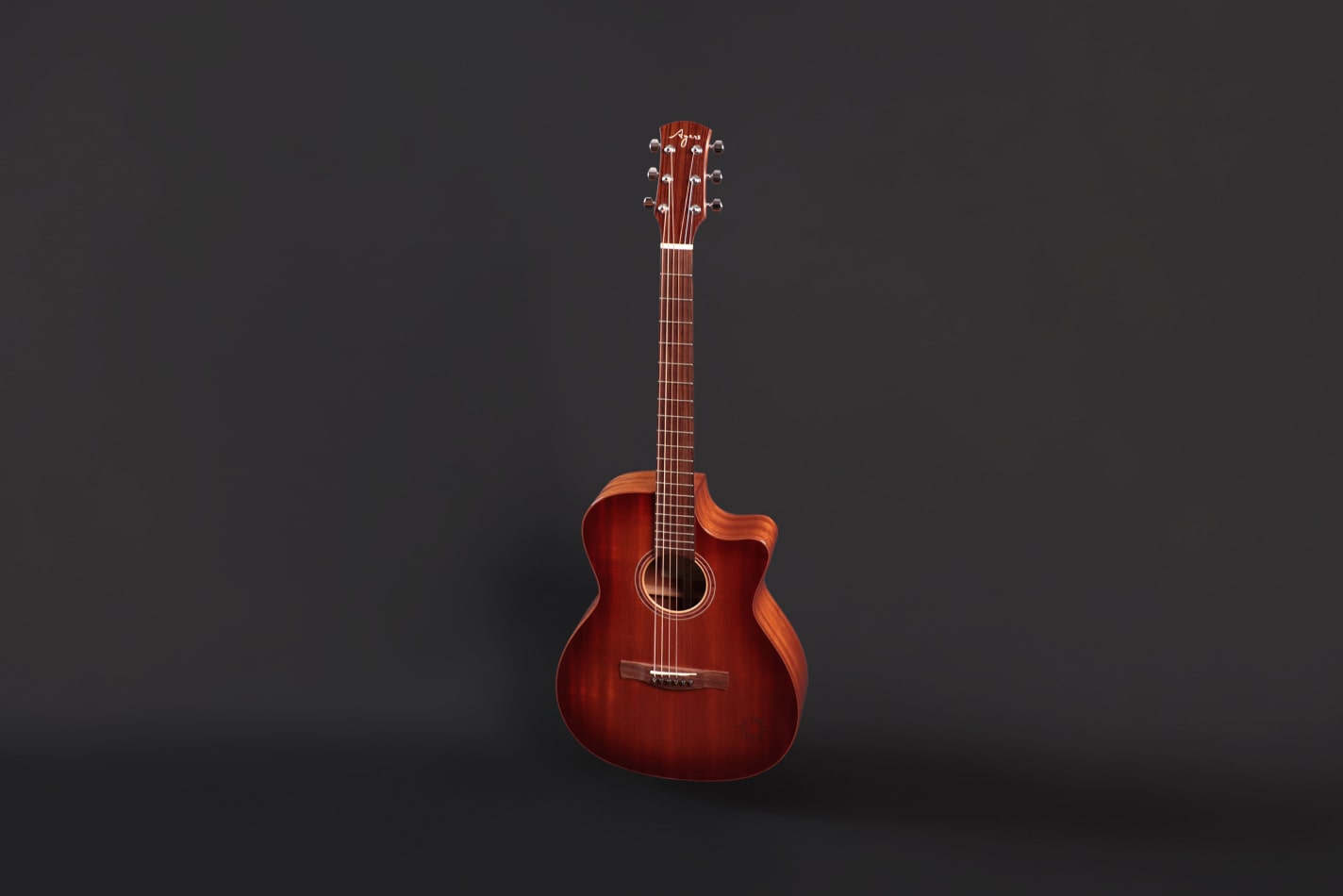 採用非洲桃花心木打造面板與側背板,搭配奧昇弦釘,面板紅棕色漸層噴漆如餘暉灑落木紋,與自然木色側背相映,展現溫暖而細膩的層次。 音色如落日餘光,溫潤柔和,中頻厚實流暢,低頻輕盈且帶有自然的律動感。